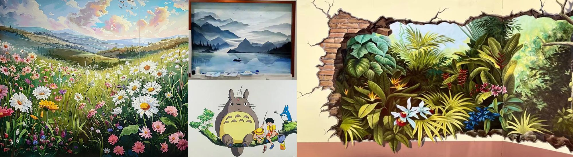 手绘涂鸦墙风格多样,有中华风情、北欧简约、田园色彩、卡通动漫等。